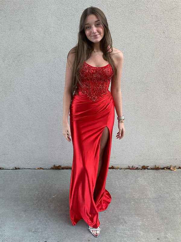 This captivating red gown radiates glamour and confidence, designed to make a bold statement at any event. The form-fitting satin fabric hugs the body, creating a sleek and elegant silhouette. The bodice is intricately adorned with exquisite beading and embroidery, adding a touch of luxury and sophistication. With a flattering sweetheart neckline and thin straps, the dress beautifully frames the shoulders and neckline. A daring thigh-high slit enhances the allure of this piece, making it perfect for prom, formal dinners, or any occasion where you want to stand out and capture attention.