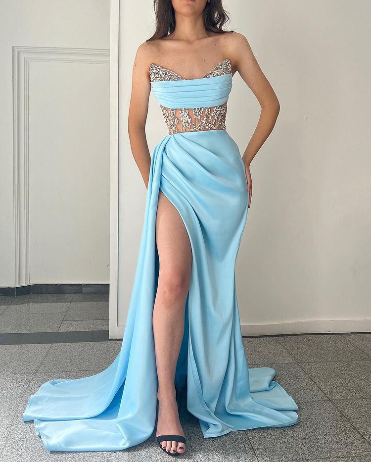 Modern Sky Blue Strapless Mermaid Prom Dress Split With Beading