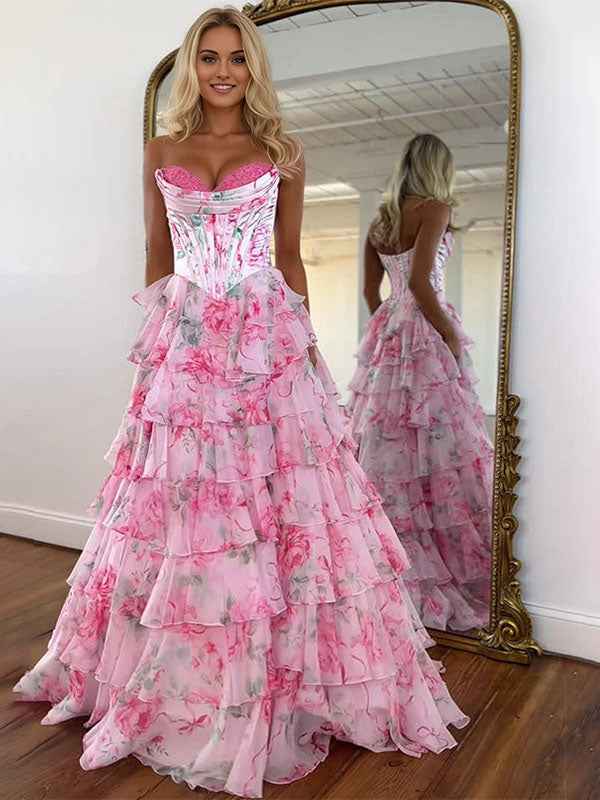 Bloom with sophistication in this enchanting pink floral prom gown, designed to mesmerize with its whimsical details and romantic silhouette. The structured corset-style bodice is designed to flatter the figure, featuring visible boning and a sweetheart neckline that highlights the d��|colletage. Adorned with a dreamy rose print, this gown exudes a fairy-tale charm that is both classic and refreshing. The floor-length skirt cascades in voluminous tiers of ruffled fabric, creating dynamic movement and a dramatic, elegant flow with every step. Perfect for garden weddings, proms, or formal galas, this gown ensures you make an unforgettable, dreamy entrance, glowing with feminine grace and poise.