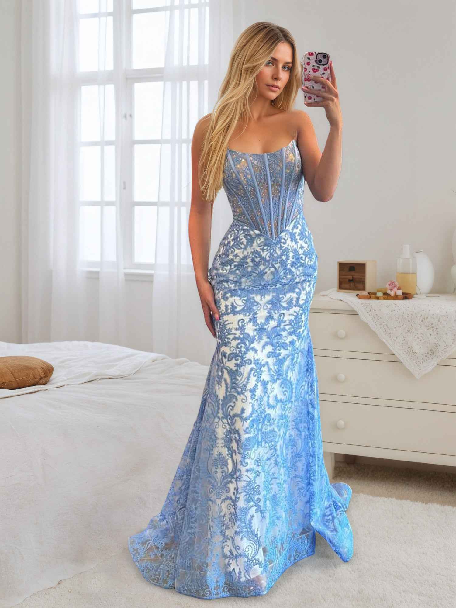 Radiate elegance in this stunning light blue prom gown, a flawless blend of modern glamour and classic details. The bodice is a true showstopper, featuring a trendy sheer corset design with exposed structural boning. It is heavily embellished with an intricate pattern of white pearls and sparkling crystals that catch the light beautifully. The luxurious satin skirt is artfully draped and ruched at the hip to flatter your curves, flowing into a floor-length silhouette. A sultry high leg slit completes the look, adding movement and a touch of allure. This gown is a top choice for prom, pageants, or black-tie galas.