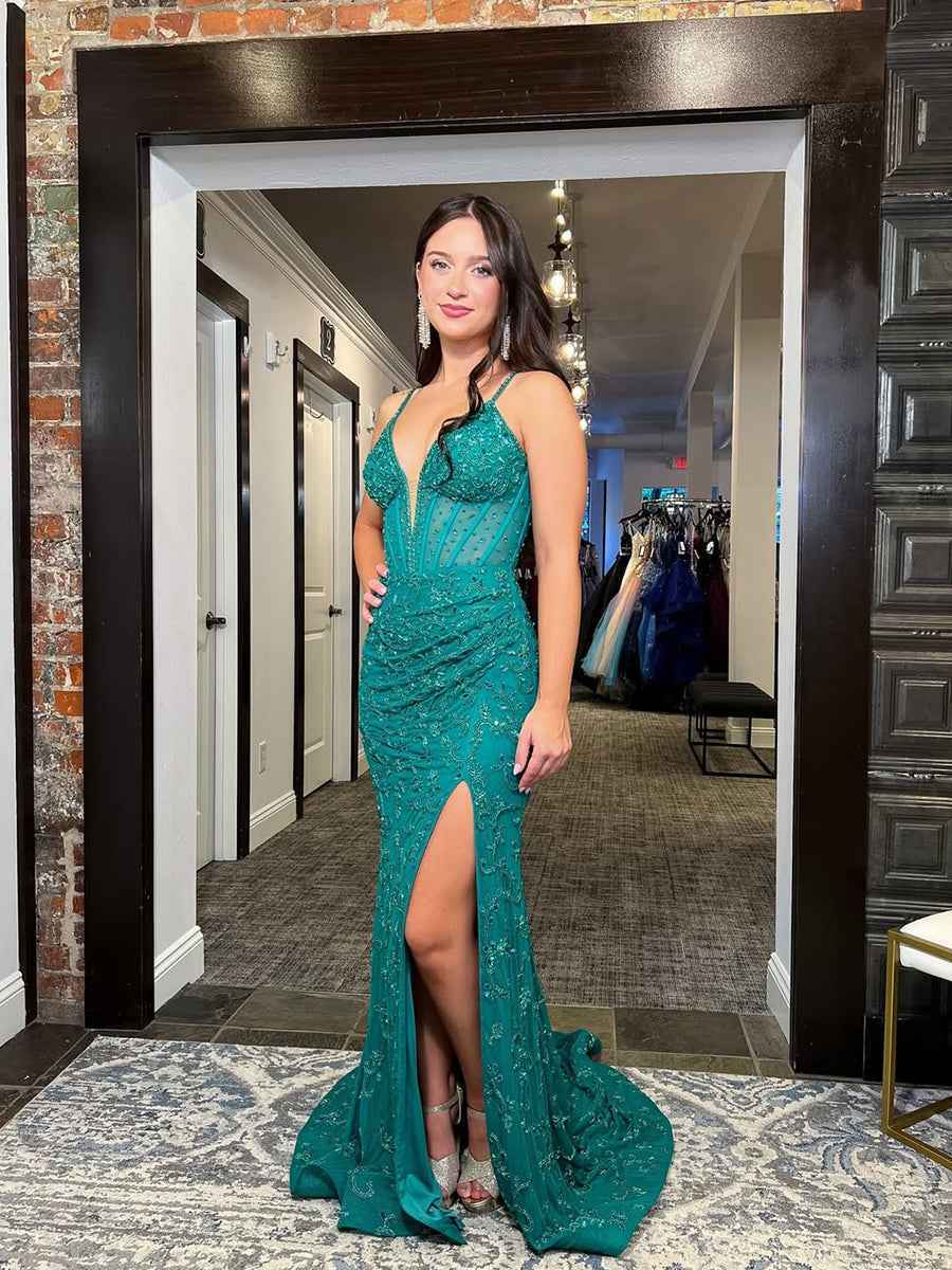 Shine with the intensity of a gemstone in this exquisite teal green prom gown. The dress features a sultry plunging V-neckline supported by delicate spaghetti straps, leading into a sheer illusion corset bodice with visible boning. The entire silhouette is covered in an intricate, swirling pattern of color-matching beads and sequins that create a mesmerizing texture from head to toe. A daring high thigh slit breaks up the fitted skirt, adding movement and allowing for a showcase of statement heels. This gown is an unforgettable choice for pageants, prom, or any event where you want to sparkle.