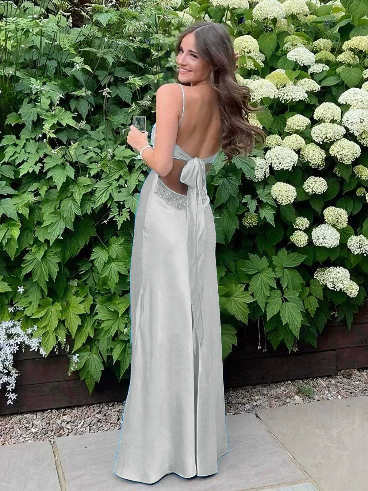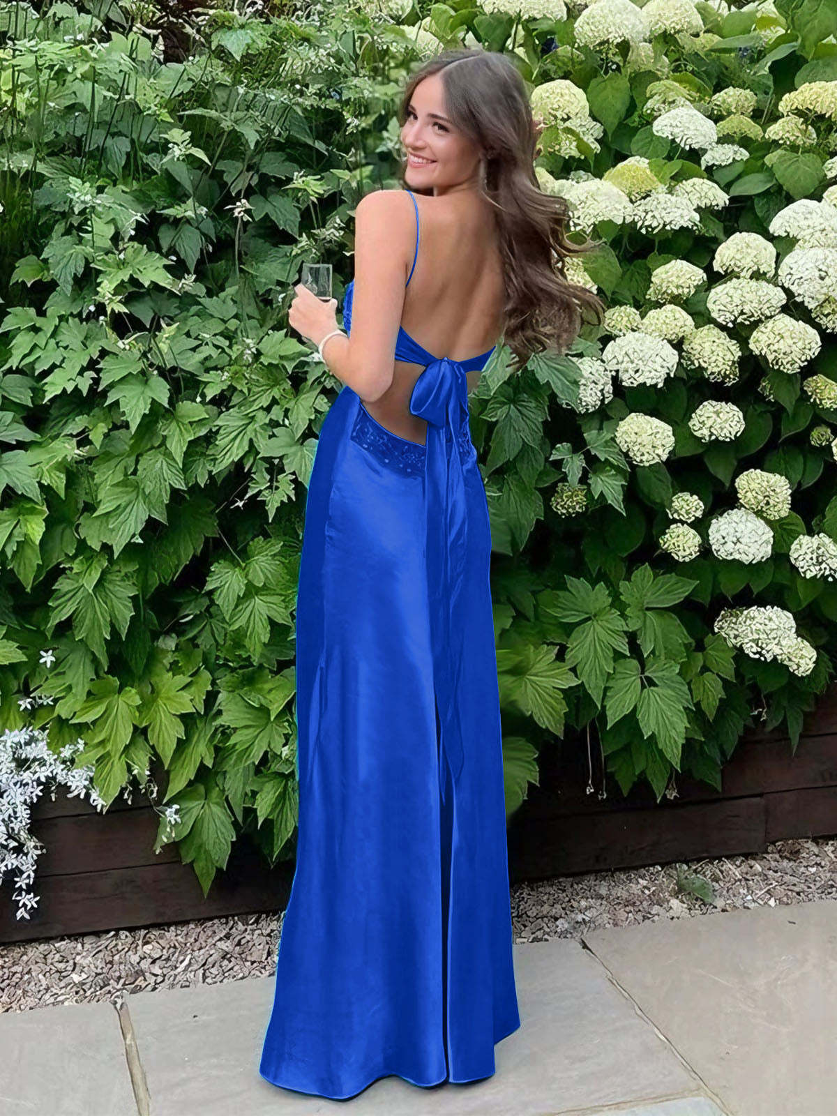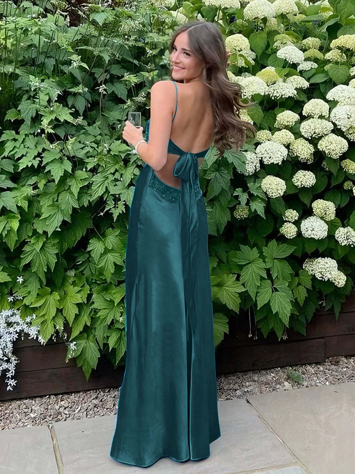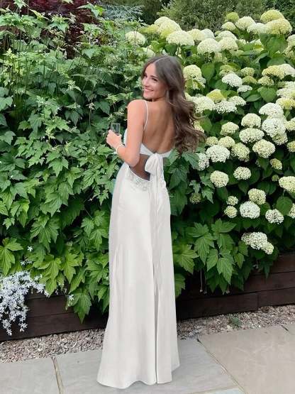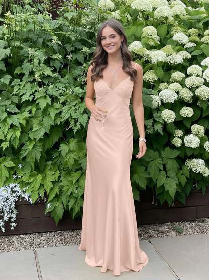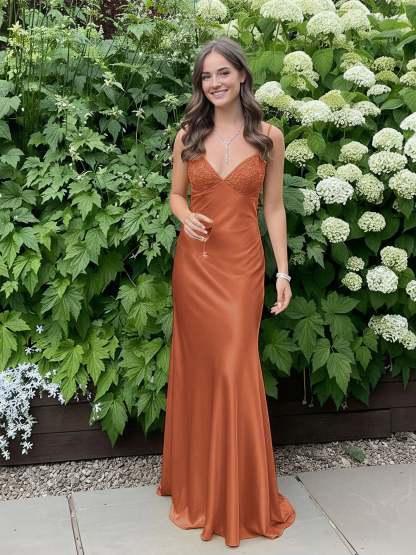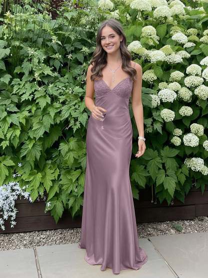 Radiate elegance and charm in this stunning satin slip gown, designed to make a bold yet graceful statement. The sleek silhouette hugs the body beautifully, while the delicate lace-trimmed bodice adds a touch of femininity and sophistication. Thin spaghetti straps frame the shoulders, enhancing the open-back design for an effortlessly alluring look. The smooth satin fabric drapes elegantly to the floor, creating a fluid and glamorous effect with every step. Perfect for prom, formal events, or any special occasion where you want to turn heads with timeless style.