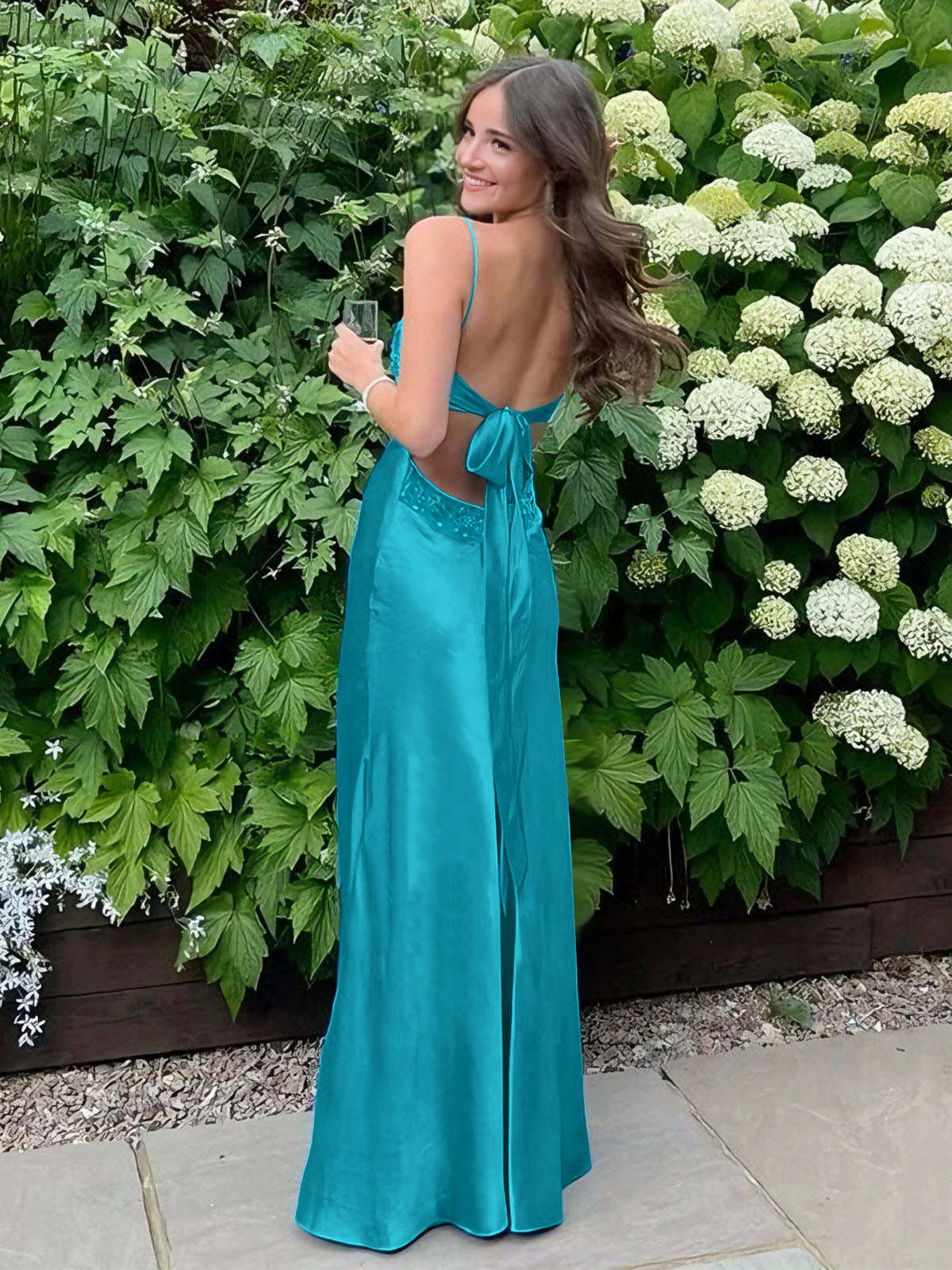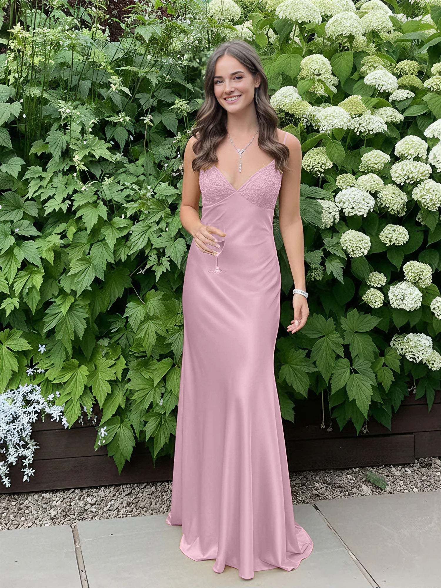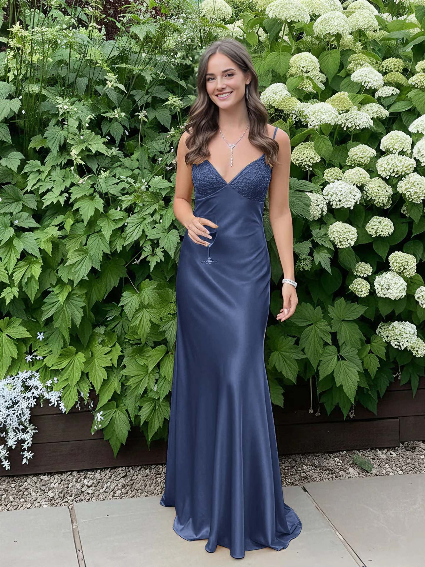 Radiate elegance and charm in this stunning satin slip gown, designed to make a bold yet graceful statement. The sleek silhouette hugs the body beautifully, while the delicate lace-trimmed bodice adds a touch of femininity and sophistication. Thin spaghetti straps frame the shoulders, enhancing the open-back design for an effortlessly alluring look. The smooth satin fabric drapes elegantly to the floor, creating a fluid and glamorous effect with every step. Perfect for prom, formal events, or any special occasion where you want to turn heads with timeless style.
