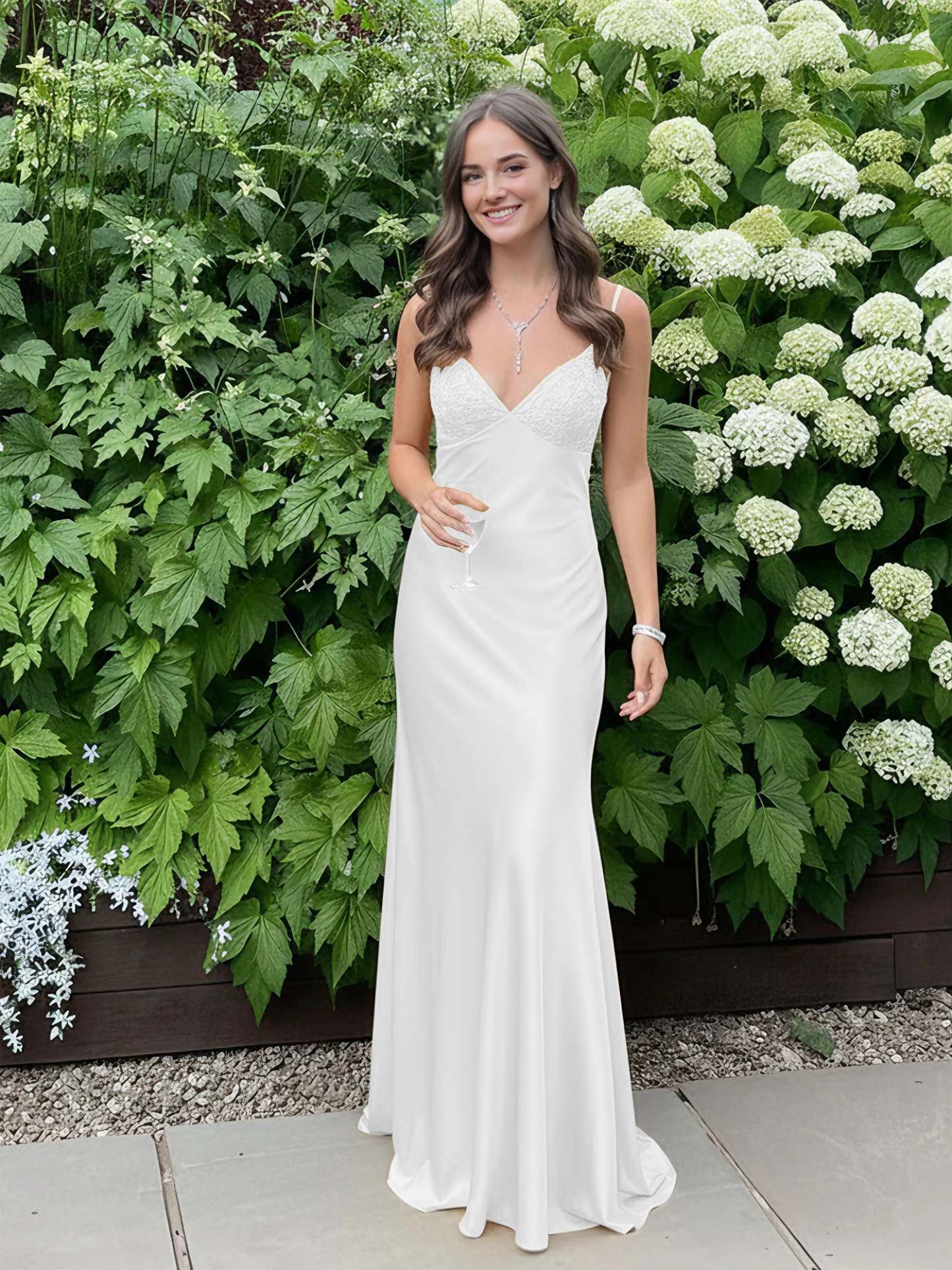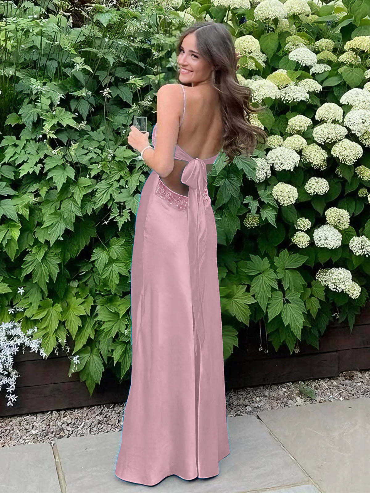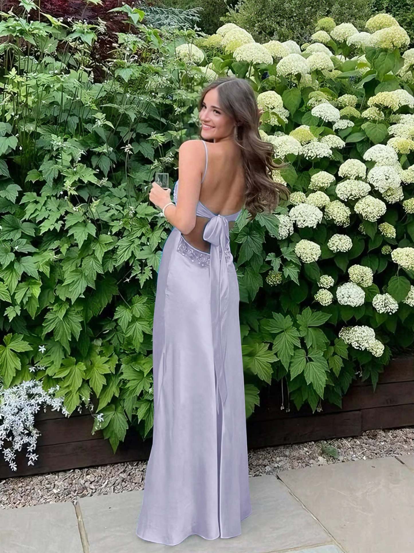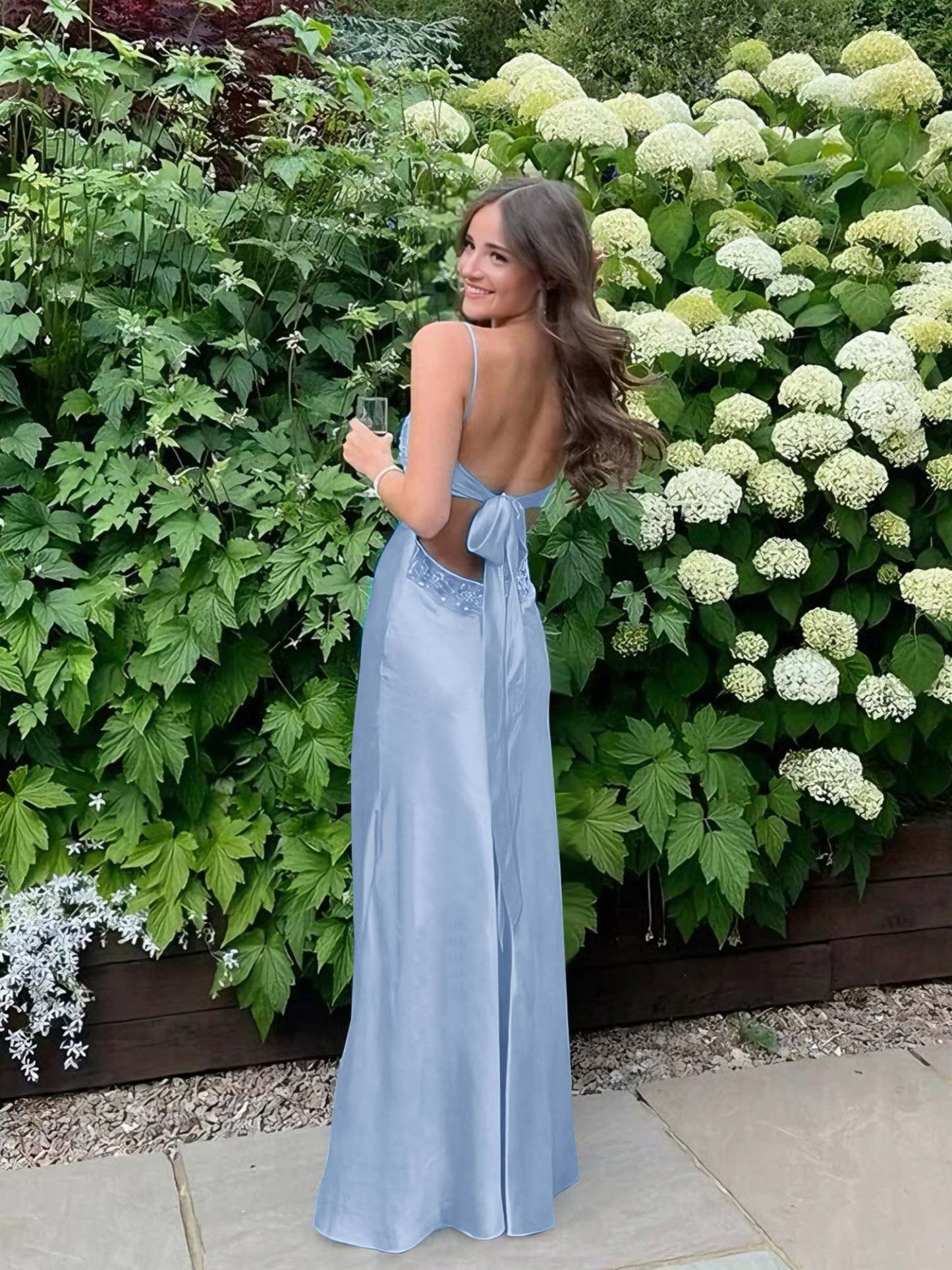 Radiate elegance and charm in this stunning satin slip gown, designed to make a bold yet graceful statement. The sleek silhouette hugs the body beautifully, while the delicate lace-trimmed bodice adds a touch of femininity and sophistication. Thin spaghetti straps frame the shoulders, enhancing the open-back design for an effortlessly alluring look. The smooth satin fabric drapes elegantly to the floor, creating a fluid and glamorous effect with every step. Perfect for prom, formal events, or any special occasion where you want to turn heads with timeless style.