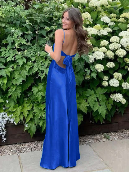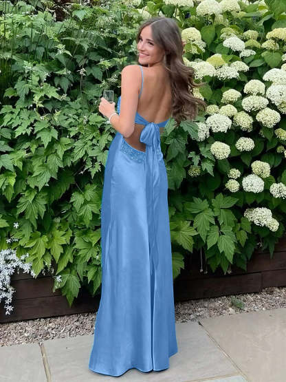 Blue A Line V-neck Beaded Back Tie Long Prom Dress