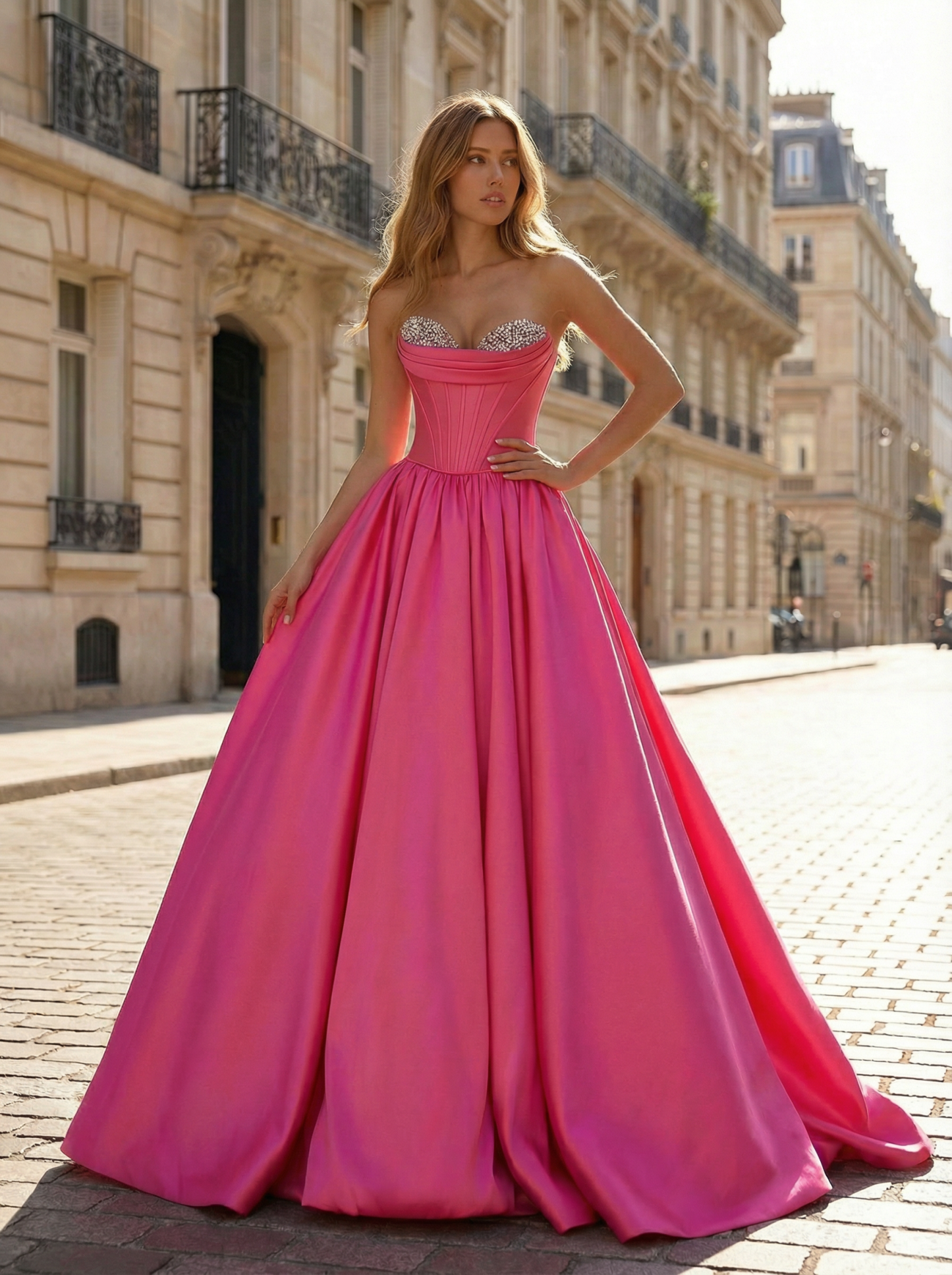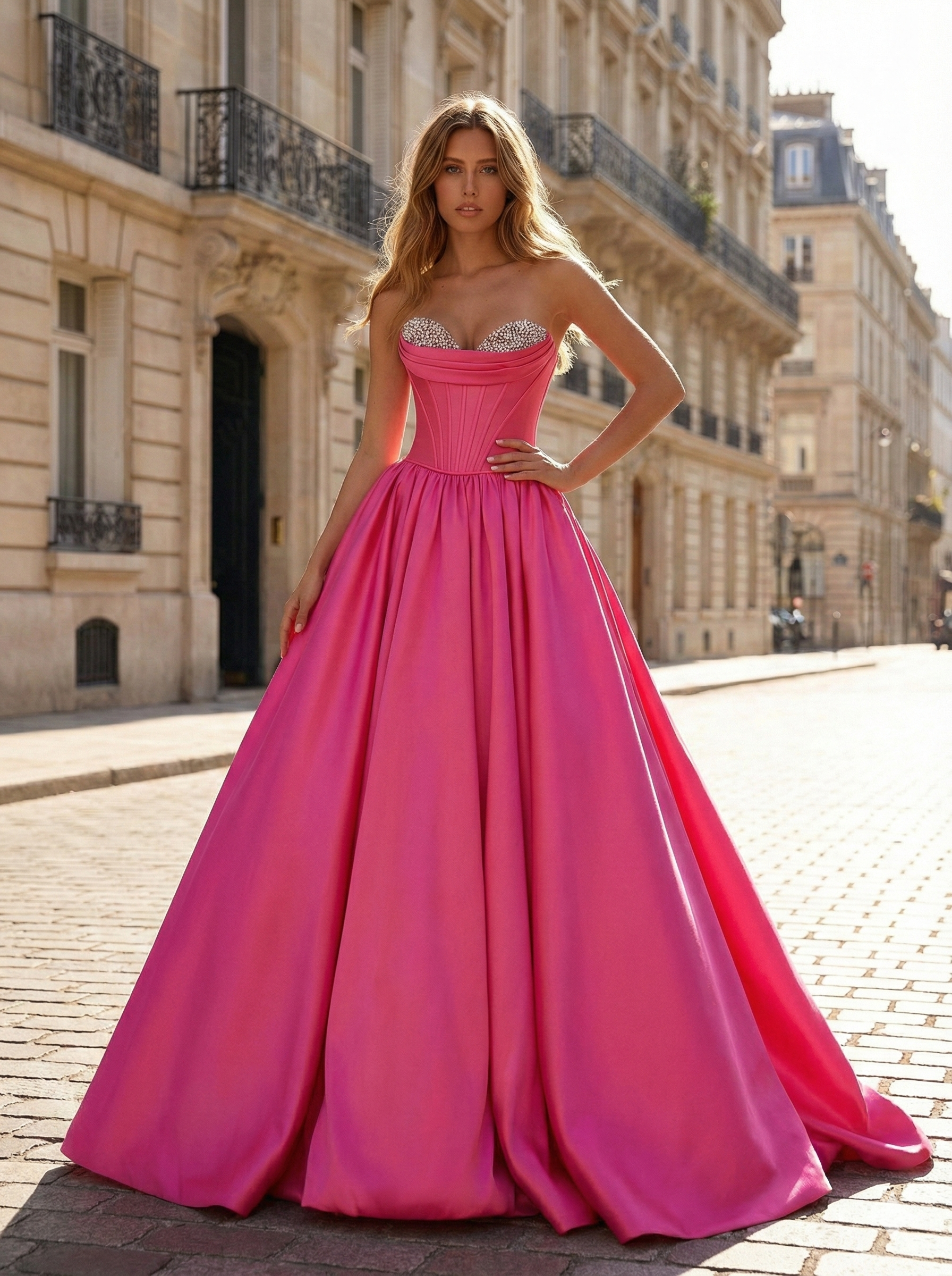 Steal the spotlight in this breathtaking fuschia ball gown, expertly crafted to combine bold color with glamorous detailing. The structured corset bodice is designed with visible boning to sculpt a flawless waistline, while the bust is heavily encrusted with dazzling crystal beadwork that sparkles intensely under the light. Featuring a romantic strapless sweetheart neckline, this gown beautifully frames the d��|colletage and shoulders. The luxurious satin fabric cascades from the waist into a voluminous floor-length skirt, creating a majestic A-line silhouette that moves with regal grace. Ideal for proms, pageants, or black-tie galas, this gown ensures an unforgettable entrance, blending modern vibrancy with classic sophistication.