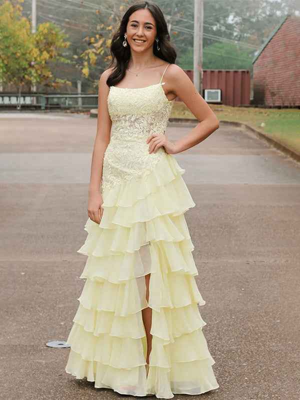 Yellow A-Line Spaghetti Straps Appliques Tiered Chiffon Prom Dress with Slit Yellow A-Line Spaghetti Straps Appliques Tiered Chiffon Prom Dress with Slit